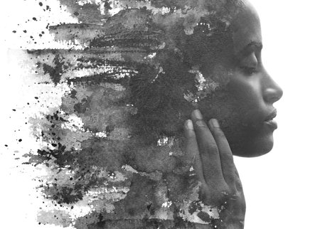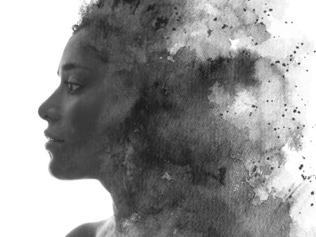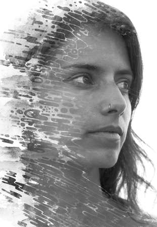 Paintography. A black and white profile portrait of a woman combined with various watercolor strokes and splashes.