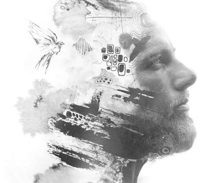 A portrait of a man combined with an abstract ink painting. Paintography