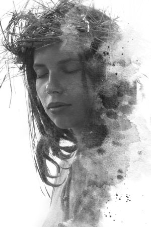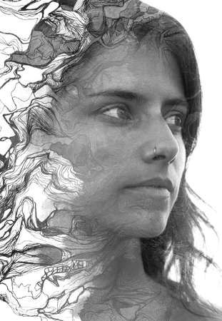 Paintography. Closeup portrait of a young woman combined with a hand-drawn floral illustration