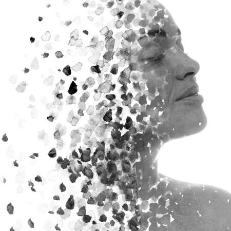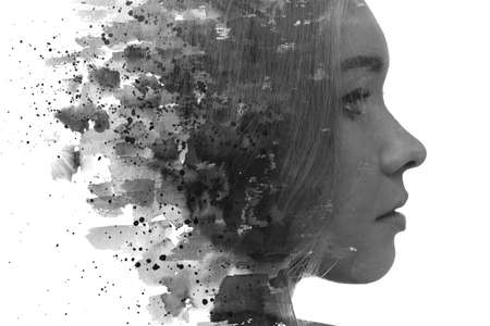 A profile portrait of a woman combined with black ink splashes. Paintography.
