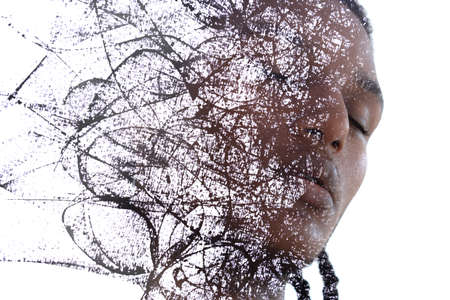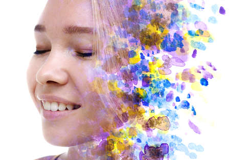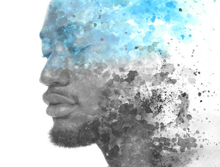 Paintography. Double exposure. Profile portrait photograph blends with colorful hand made painting on white background