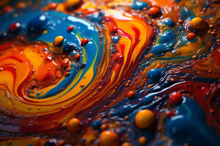 A macro shot of a creative background with abstract acrylic painted colorful patterns