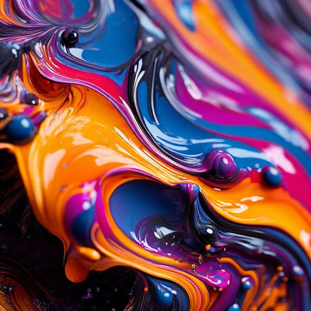 Thick liquid paint mixing, forming dynamic flowing patterns and intricate splashes with diverse colors