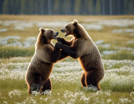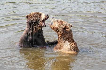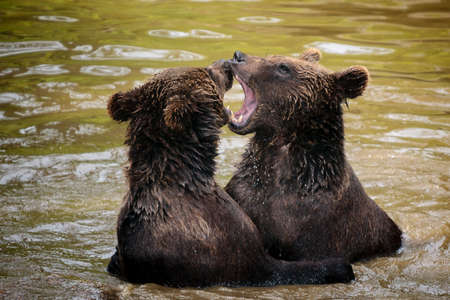 Brown Bears growl at each other while appearing to play and bond in partnership