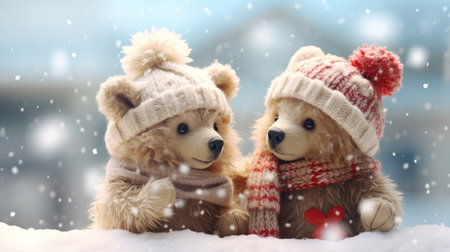 Cute Christmas teddy bears with a snowy macro backdrop AI generated illustration