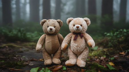 Two teddy bears sitting in the forest in a foggy day