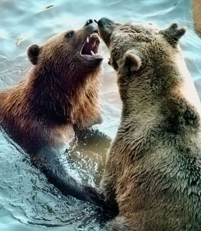 close-up portrait of two big brown bears fighting with mouthes open with teeth and paws with claws looking aggresive