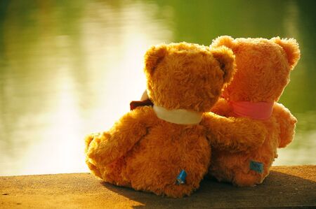 Two teddy bears with nature background, Love relationship concept