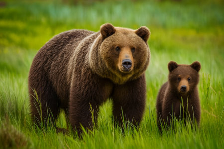 AI-Generated image of a powerful grizzly bear standing protectively beside its cub in a lush green meadow. The adult bear’s thick brown fur and strong presence contrast with the smaller cub’s softer, lighter coat.