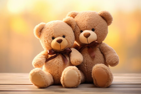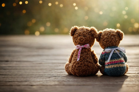 Two teddy bears on a wooden background with bokeh effect