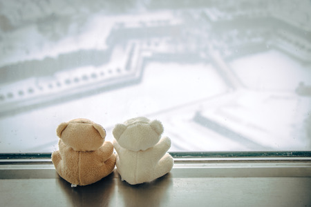 Lovely couple bear sit together on stainless bar beside window at snowy day, Goryokaku park, Hokkaido, Japan
