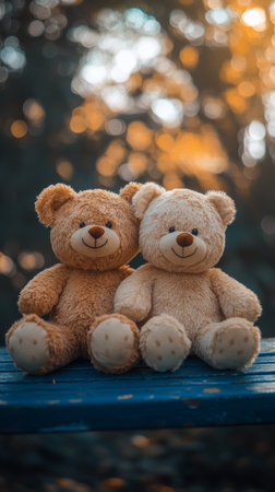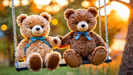 A charming image of two plush teddy bears with blue bows sitting on a swing, captured against the golden backdrop of a sunset. AI generation