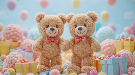 Two adorable teddy bears with pink bows stand amidst colorful candies and gifts, creating a cheerful and sweet atmosphere.