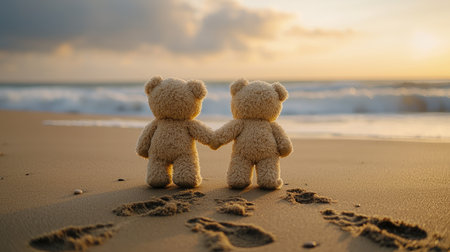 Two teddy bears holding hands on a beach at sunset, creating a warm and nostalgic atmosphere filled with love and companionship.