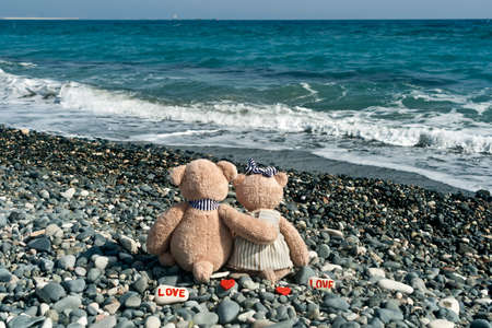 Two teddy bears in love sitting on stone beach in front of wavy sea