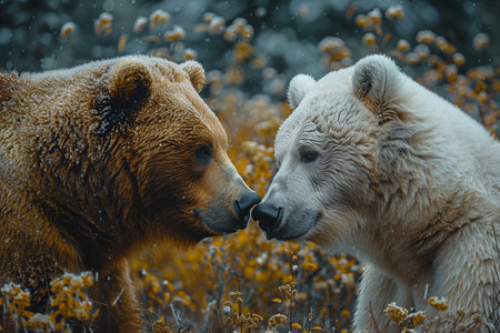 Two bears with contrasting fur colors touching noses amidst a field of yellow flowers.