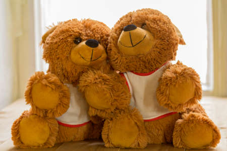 Two teddy bear plush toy on a sofa. Concept of love and togetherness