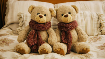 Two teddy bears sitting next to each other on a bed generative ai