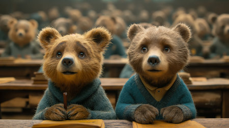 two bears sitting at a school desk, school learning. Generative AI