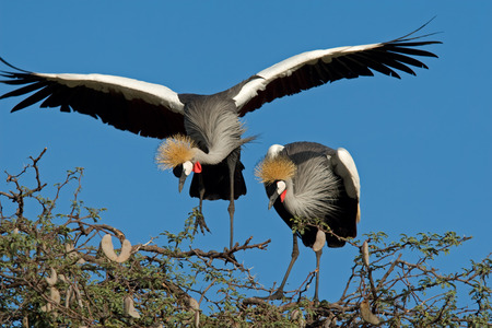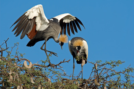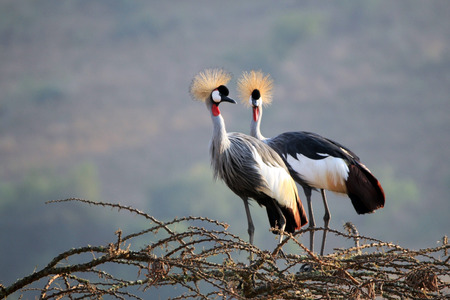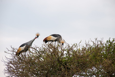 Grey Crowned Crane (Balearica Regulorum) Couple on Tree Top. Lake Mburo, Uganda