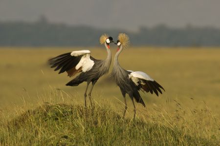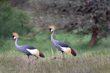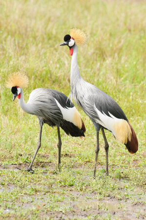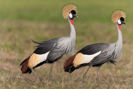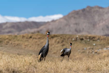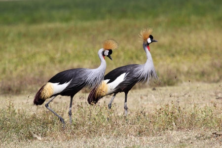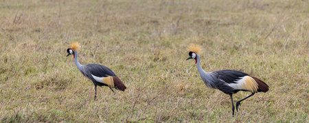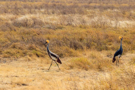 Couple of grey crowned cranes (Balearica regulorum) in the savannah, Serengeti National Park, Tanzania