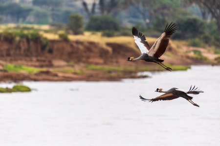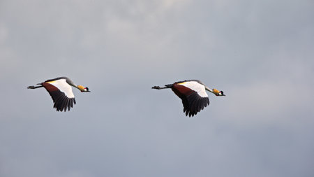 The black-crowned cranes flying in the daylight sky in Tanzania