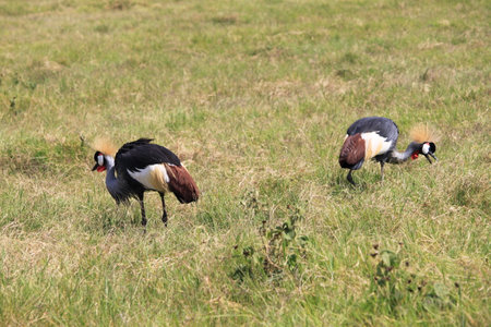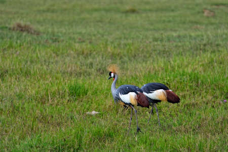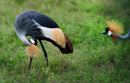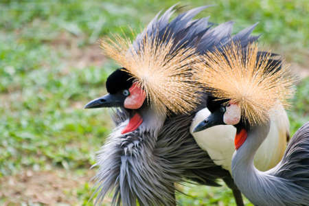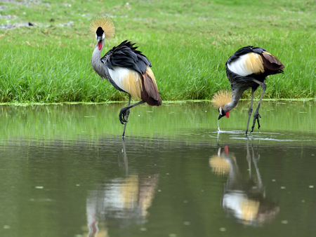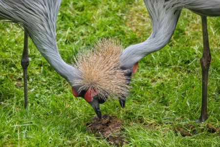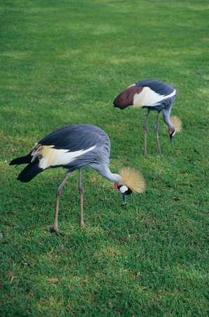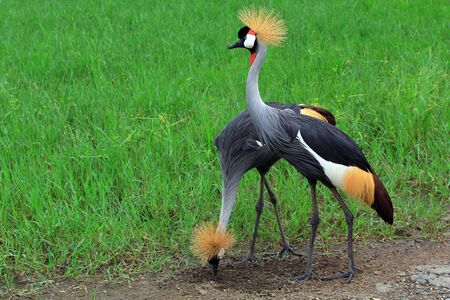 Couple of Grey crowned cranes (Balearica regulorum gibbericeps) digging in the grass, other names: crested crane, bird in the family Gruidae.