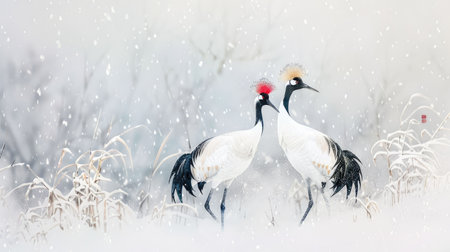 Red-crowned cranes in a snowy meadow, their elegant forms standing out against the white background
