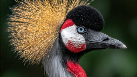A detailed close-up portrait of a Gray Crowned Crane, showcasing its unique golden crest, white and red facial markings, and elegant plumage.