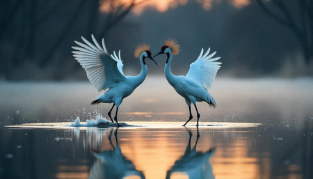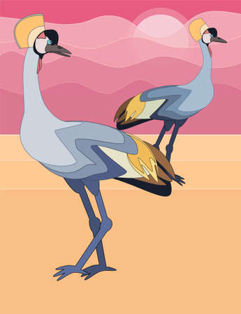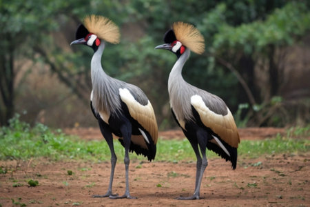 Two elegant african crowned cranes with their distinctive golden crowns stand near a water puddle at sunset. this wildlife portrait captures their beauty and grace.