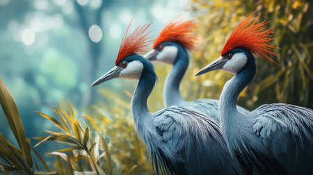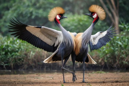 A group of Grey Crowned Cranes (Balearica regulorum) dancing in Uganda's Murchison Falls National Park, their golden crests and red throat pouches a vibrant display of courtship.