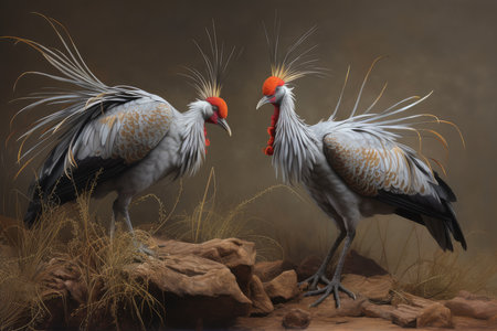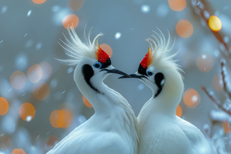 Two Elegant White Birds with Striking Black and Red Head Feathers.