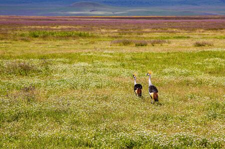Two Crowned Cranes in the flowering savannah of Ngorongoro Crater, Tanzania