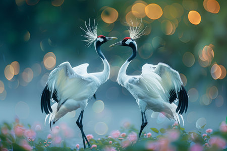 A pair of white-crowned cranes perform a graceful dance, their heads touching in a tender embrace, surrounded by a field of delicate pink blossoms and a soft, ethereal bokeh effect.