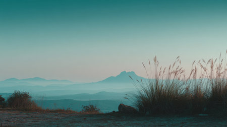 A breathtaking mountain landscape showcasing a misty horizon at sunrise. The soft gradients of blue and green sky create a tranquil and serene atmosphere.