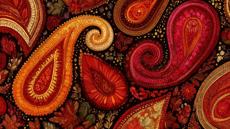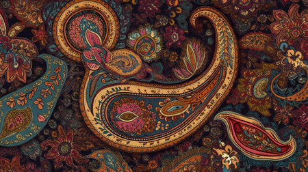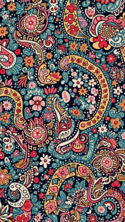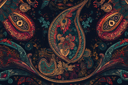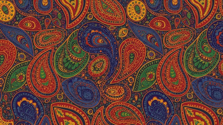 A vibrant and intricate paisley pattern with detailed floral and geometric elements in rich, bold colors.
