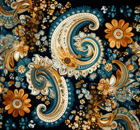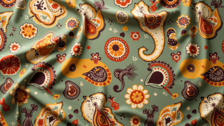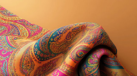 Colorful paisley pattern on draped fabric with floral motifs in orange, yellow, and green. That the image is generated using AI.