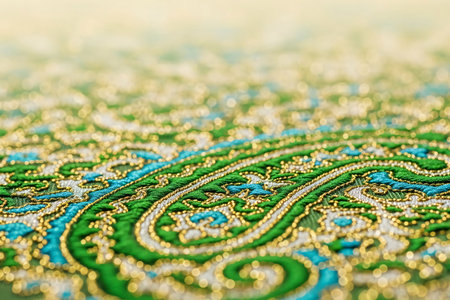 Intricate fabric pattern with vibrant colors displayed in a close-up shot