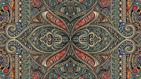 A vibrant and intricate abstract pattern with a symmetrical design, showcasing rich colors like red, blue, green, and yellow in detailed motifs.