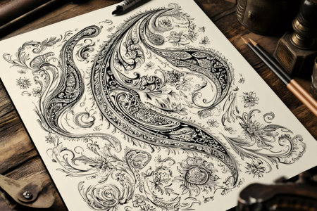 Artist's desk showcasing a coloring page filled with detailed paisley patterns, ready for creative expression