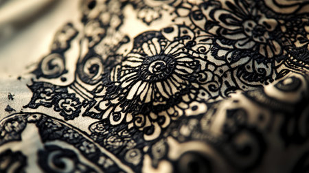 The detailed black floral designs on cream fabric showcase the artistry of traditional textile craftsmanship, emphasizing intricate patterns and textures.