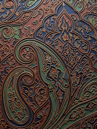 Engraved paisley patterns in vibrant colors on a dark background