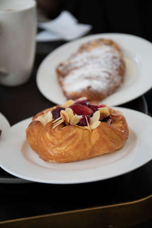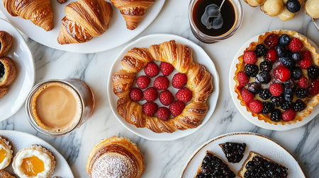 Delicious assortment of fresh pastries and desserts served on a marble table with coffee in the morning light