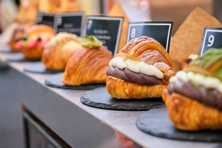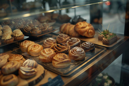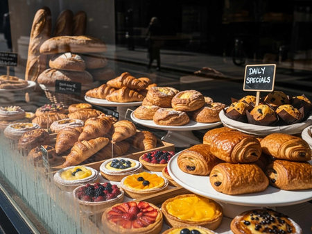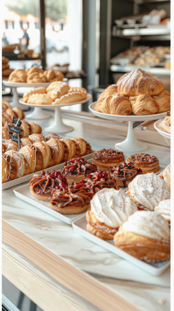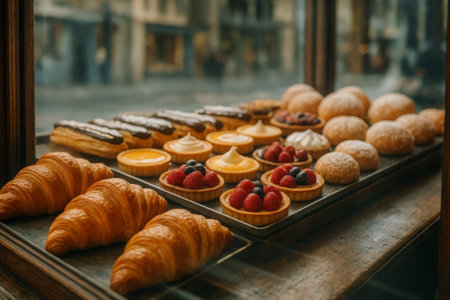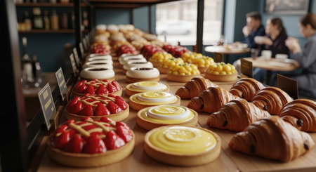 Modern patisserie display tempting cakes, croissants, and pastries to satisfy your sweet cravings