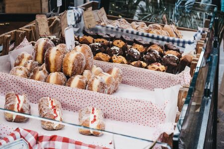 Variety of fresh doughnuts, muffins and pastries on sale at a food market in London, UK.