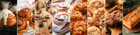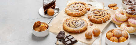 Desserts assortment on light background. Freshly made bakery and treats. copy space, panorama