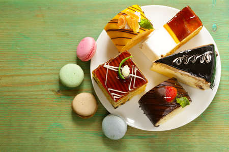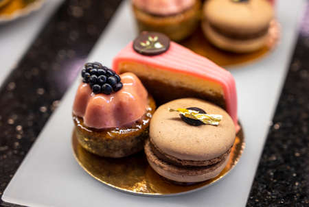 Assorted mini cakes sweet dessert, chocolate and fruit