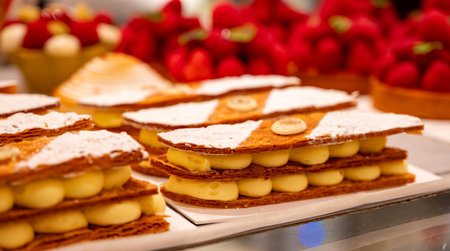 Portion of french mille-feuille cake, vanilla or custard slice, Napoleon puff pastry layered with pastry cream in bakery