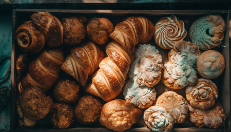 Freshly baked pastries lined up for sale in a cozy bakery displaying golden brown textures and powdered sugar. Generative AI