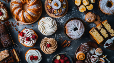 An assortment of various desserts, including cupcakes, bundt cakes, and pastries, arranged on a dark table, creating a delicious and inviting scene.